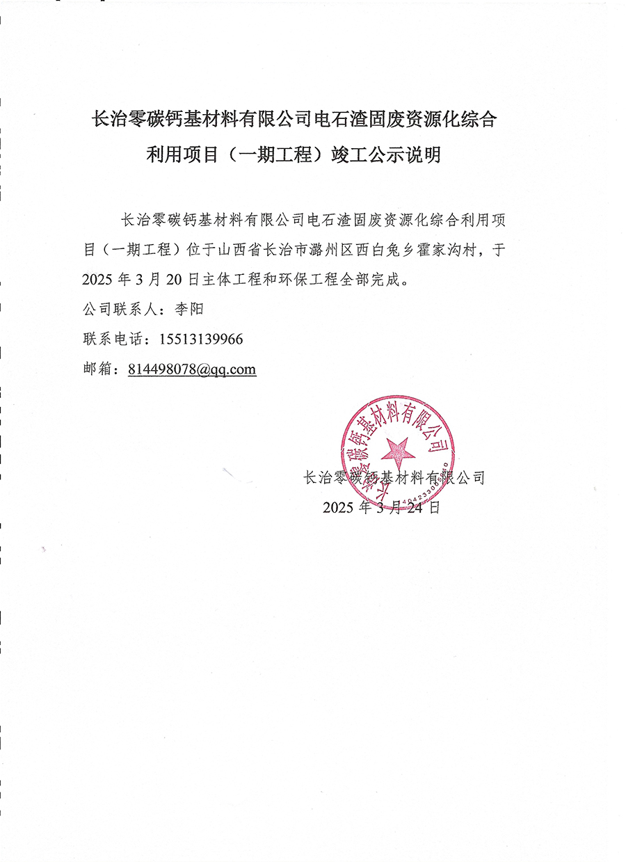 長治零碳鈣基材料有限公司電石渣固廢資源化綜合利用項目(一期工程)竣工公示說明